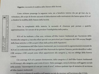 Nel corso della votazione del punto all’ordine del giorno inerente la modifica dello statuto di Sca, i consiglieri Distilo, Porro e Ciangherotti hanno deciso di lasciare l’aula in segno di protesta: “Venuta meno la trasparenza della maggioranza - aggiungono ancora i consiglieri -, non abbiamo potuto fare altro che prenderne atto e uscire dall’aula senza votare. Va inoltre precisato che la modifica dello statuto approvata ieri dà la possibilità alla società di iscriversi all’albo regionale dei gestori ambientali per il trasporto conto terzi. Un atto che, tuttavia, la società avrebbe dovuto già possedere in quanto gestore del servizio di fognatura per l’aspirazione dei rifiuti delle fosse settiche”.