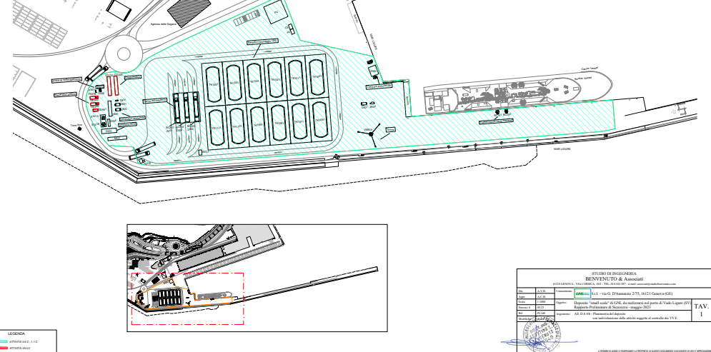 "Ciascuna delle due fasi, del tutto indipendenti tra loro, sarà oggetto di un distinto Rapporto Definitivo di Sicurezza su una base progettuale particolareggiata; il Rapporto Preliminare di Sicurezza è relativo all’impianto di stoccaggio di GNL (Gas Naturale Liquefatto) e BioGNLdi piccola taglia (small scale) da realizzarsi nel bacino portuale di Vado Ligure, nel Comune di Bergeggi e rappresenta una variante al Rapporto preliminare del 2021, già dotato di Nulla Osta di Fattibilità del 27 aprile del 2022; l’esigenza di elaborare un nuovo Rapporto Preliminare in variante rispetto al sopracitato nulla osta di fattibilità nasce dalla richiesta dell’Autorità di Sistema Portuale del Mar Ligure Occidentale di apportare alcune modifiche sostanziali al progetto del deposito studiato nel Rapporto del dicembre 2021; in merito si è espresso il Comitato Tecnico Regionale che ha terminato la fase di istruttoria tecnica nella riunione del 14 luglio 2023" viene spiegato