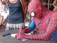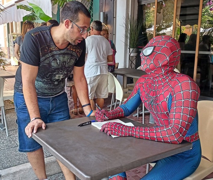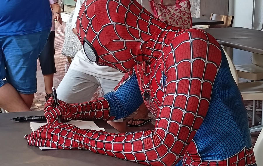 Allo Spazio Buga Buga tante persone e bambini hanno accolto e ascoltato con interesse gli aneddoti e i pensieri raccontati dall'autore, nato nel 1993 a Savona, che ha parlato, con delicatezza e una sincerità disarmante, del suo rapporto con Spiderman, della sua malattia, della sua vita, dei suoi obiettivi futuri e soprattutto del suo hobby: il volontariato. Ha spiegato come si può cambiare pelle per aiutare gli altri, ma si è anche soffermato sulla responsabilità e la sofferenza che comporta indossare una maschera. Mattia riesce a far coincidere il suo lavoro, come impiegato terminalista al porto di Vado Ligure, con il suo passatempo preferito, che ormai è diventata una missione: regalare un sorriso ai bambini.