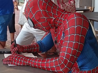 Allo Spazio Buga Buga tante persone e bambini hanno accolto e ascoltato con interesse gli aneddoti e i pensieri raccontati dall'autore, nato nel 1993 a Savona, che ha parlato, con delicatezza e una sincerità disarmante, del suo rapporto con Spiderman, della sua malattia, della sua vita, dei suoi obiettivi futuri e soprattutto del suo hobby: il volontariato. Ha spiegato come si può cambiare pelle per aiutare gli altri, ma si è anche soffermato sulla responsabilità e la sofferenza che comporta indossare una maschera. Mattia riesce a far coincidere il suo lavoro, come impiegato terminalista al porto di Vado Ligure, con il suo passatempo preferito, che ormai è diventata una missione: regalare un sorriso ai bambini.