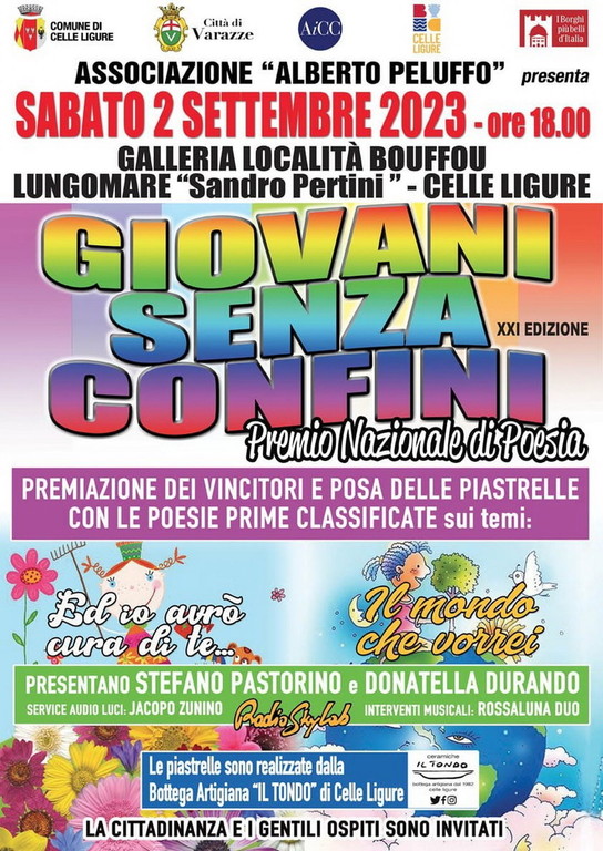 Sabato 2 settembre 2023 alle 18, sul lungomare "Sandro Pertini" di Celle Ligure, all’altezza della località Bouffou, si terrà la premiazione della 21ma e 22ma edizione del premio nazionale di poesia "Giovani Senza Confini", organizzato dall’Associazione Culturale "Alberto Peluffo", di cui Anna Ratto è presidente, con i patrocini dei comuni di Varazze e Celle Ligure.