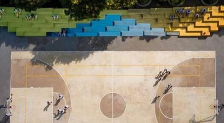 La pavimentazione preesistente sarà pulita con l'asportazione di ogni residuo e sarà rifatta con un sistema multistrato ad elevata elasticità a base di resine acriliche in dispersione acquosa con tappetino in gomma granulare per campi multisport outdoor. Il colore sarà tinta terra di Siena bruciata con colorate in varie cromie le linee delimitanti le aree da gioco dei vari sport praticati. Si avranno tracciati ed arredi specifici per il gioco del basket, pallavolo, calcetto e paddle/tennis.
