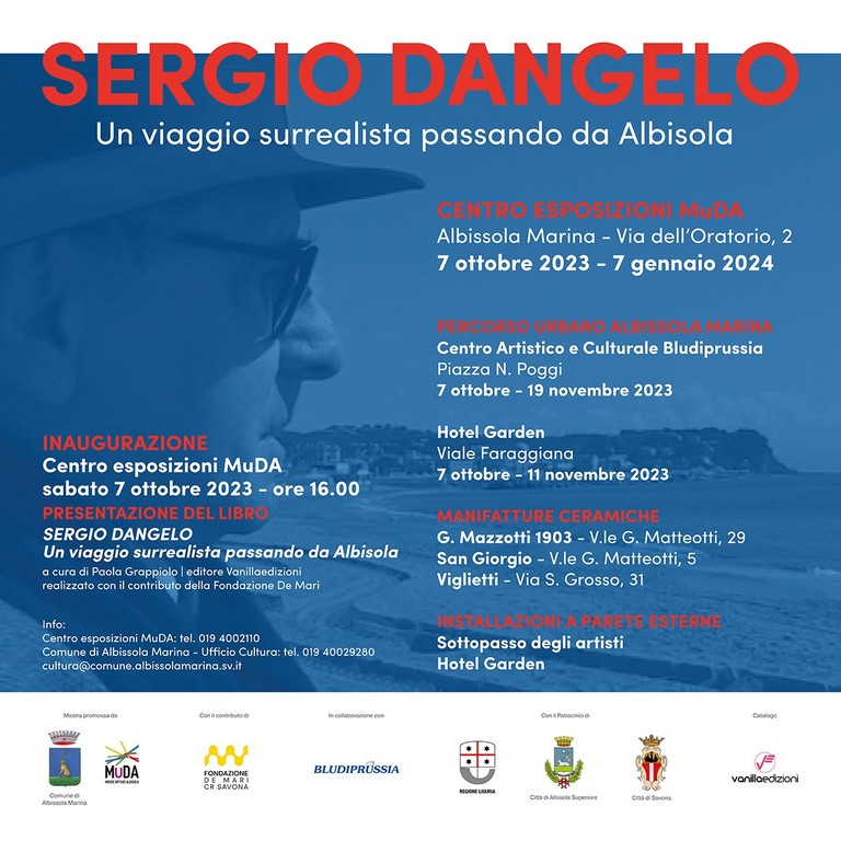 A un anno e mezzo dalla scomparsa del Maestro Sergio Dangelo (19/04/1932 – 04/01/2022), la città di Albissola Marina ne omaggia il genio e la memoria con la presentazione di un libro sull’artista, sostenuto dalla Fondazione De Mari e una mostra promossa dal Comune di Albissola Marina, entrambi a cura di Paola Grappiolo, gallerista e curatrice attiva ad Albisola da trentadue anni, amica storica di Sergio Dangelo. L’evento è stato fortemente voluto da molti concittadini albisolesi, gli stessi amici che hanno costantemente accompagnato e sostenuto Dangelo nelle sue incursioni poetiche e artistiche nella ormai mitica città ligure di antica tradizione ceramica. L’iniziativa è patrocinata dalla Regione Liguria, la Città di Savona e la città di Albisola Superiore
