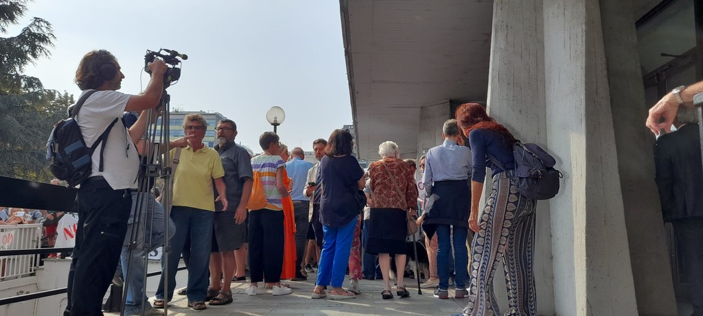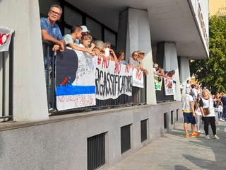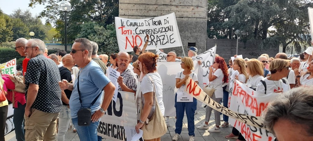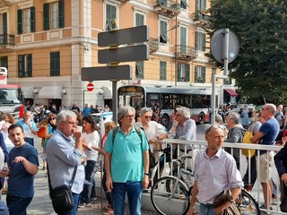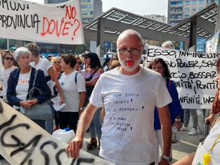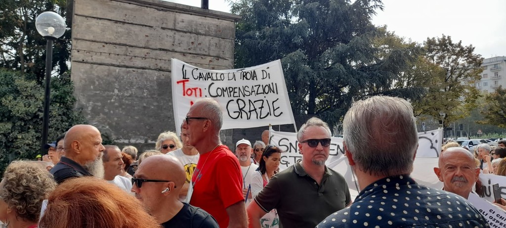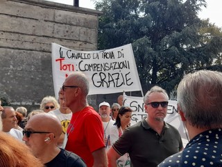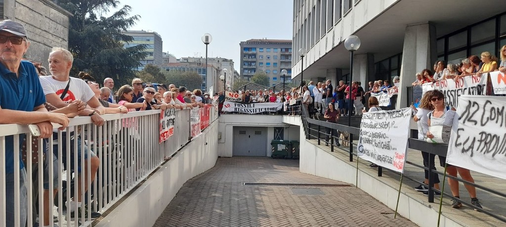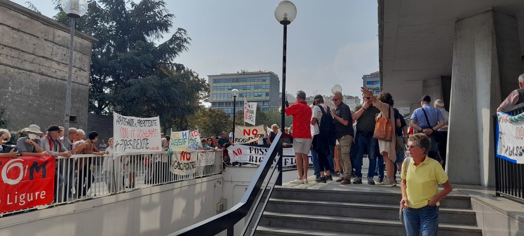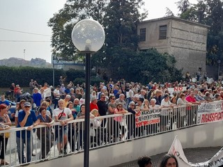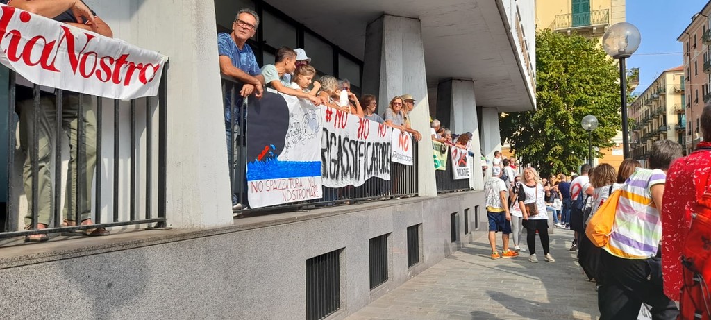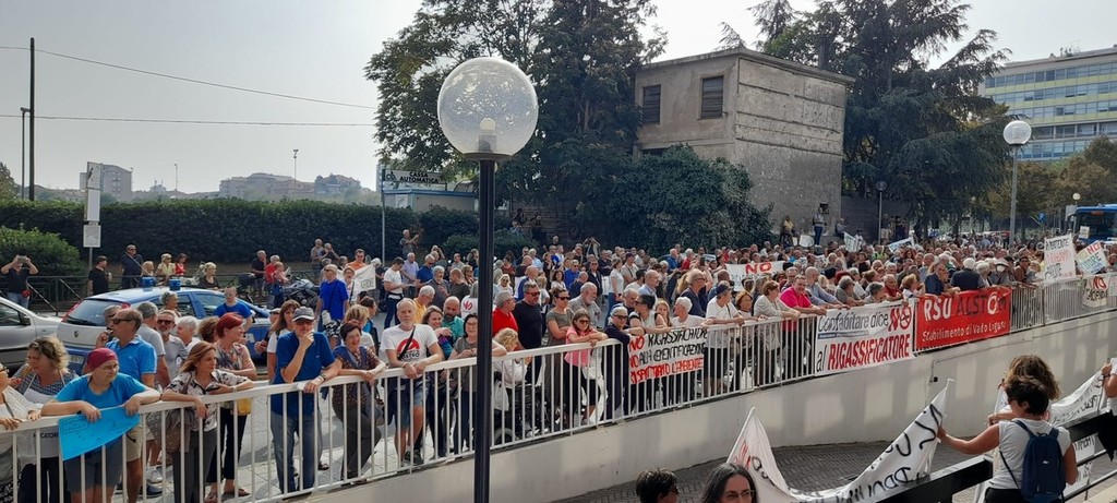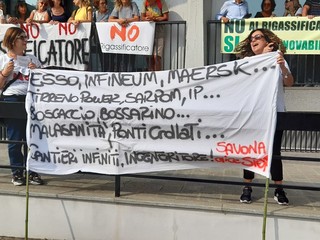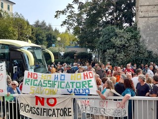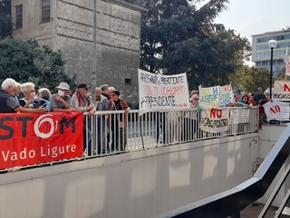 Cori, fischi, striscioni, trombe da stadio, il blocco della strada che non era previsto, per dire il proprio no secco al progetto. Non sono mancati anche gli slogan all'urlo di "Vergogna, vergogna" all'arrivo del presidente regionale Giovanni Toti che non è passato dall'ingresso principale ma dal parcheggio sotterraneo.