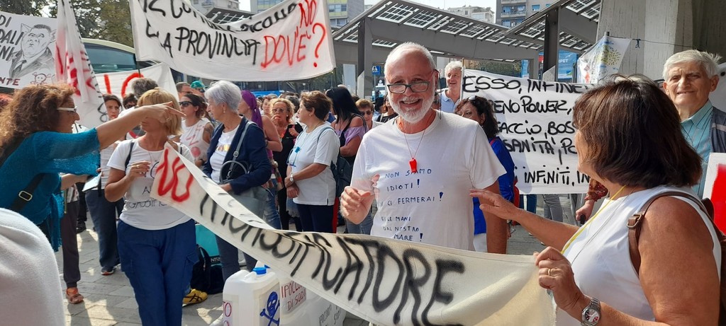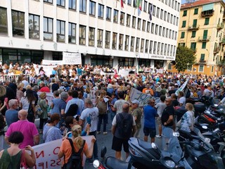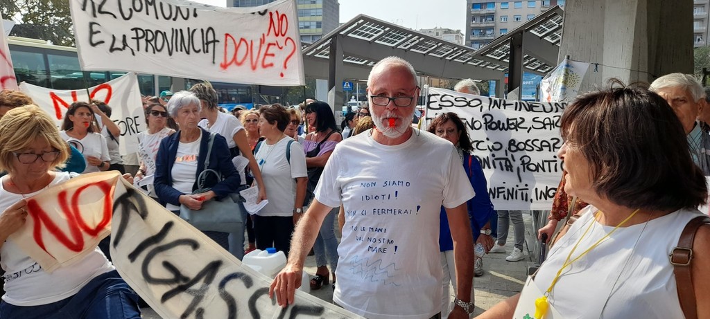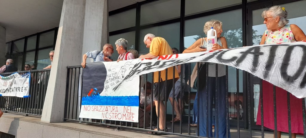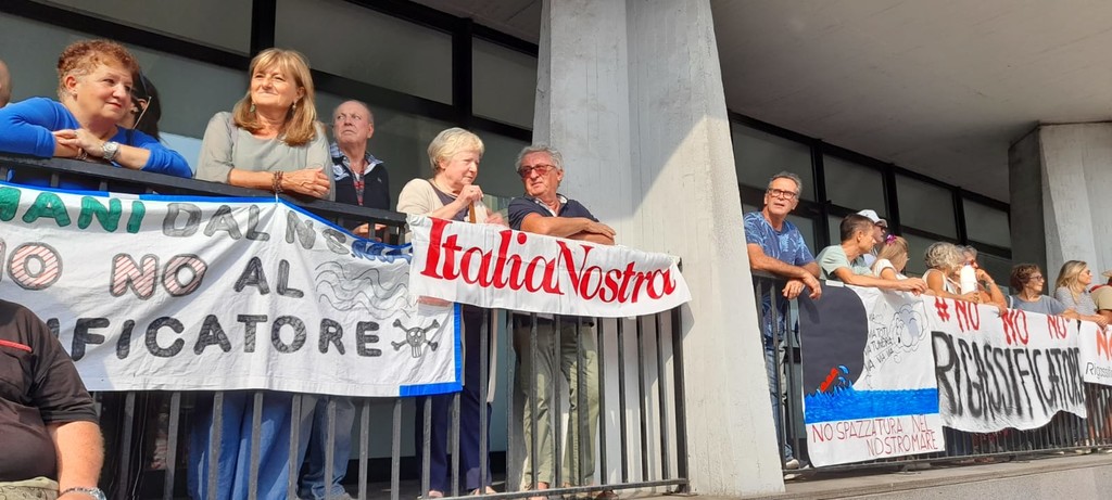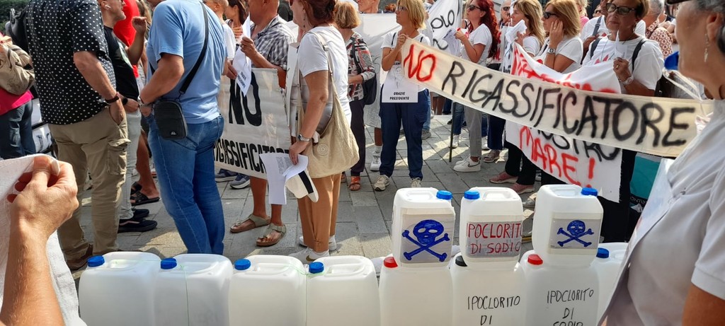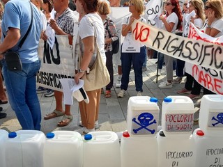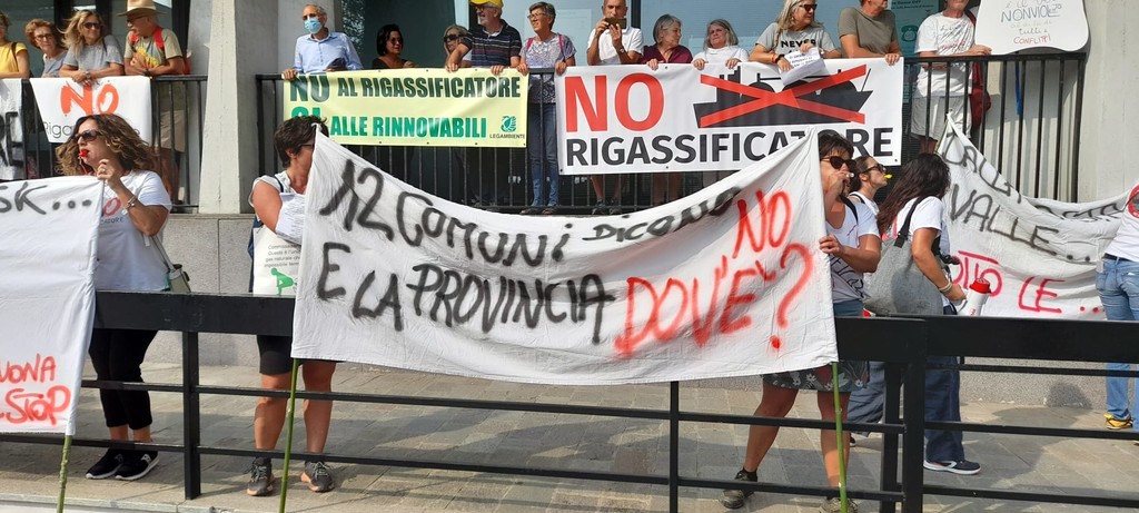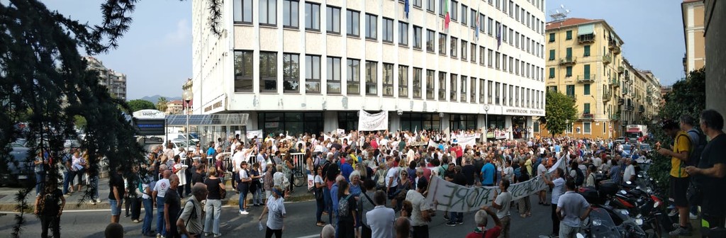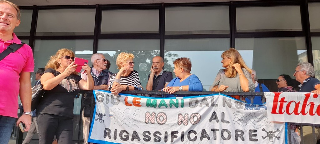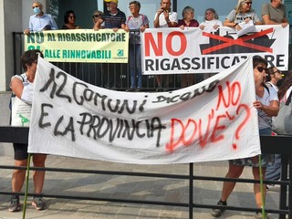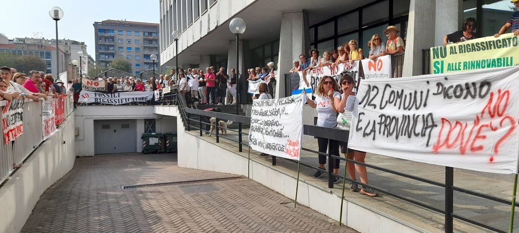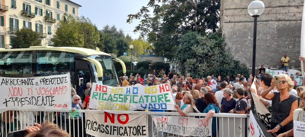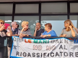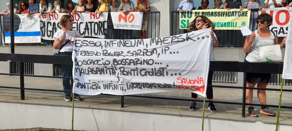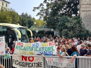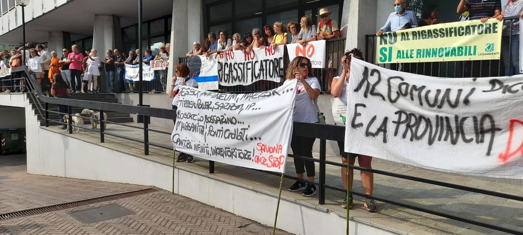In tantissimi, comitati, associazioni, cittadini si sono ritrovati davanti alla Provincia e hanno espresso la propria contrarietà al posizionamento della nave rigassificatrice "Golar Tundra" a 4 km dalla costa di Vado Ligure e a 2.9 da Savona.