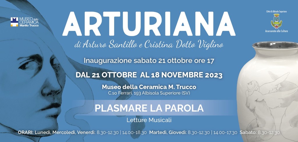 Sabato 21 ottobre 2023 alle ore 17 presso il Museo Manlio Trucco di Albisola Superiore sarà inaugurata la mostra “Arturiana” di Arturo Santillo nata dalla collaborazione con la poetessa Cristina Dotto Viglino. I versi di quest'ultima non solo hanno suscitato la creatività dell'artista ma in qualche situazione è avvenuto il contrario. Tale scambio di sollecitazioni ha prodotto le immagini che caratterizzano i piatti, i quattro vasi e le tre teste-sculture, per un totale di ventisei opere talora ornate dalle parole che ne hanno suggerito la nascita. Si tratta di lavori che esaltano il rapporto d'amore tra l'uomo e la donna in perenne lotta con le insidie dell'esistenza. L'esposizione di ogni ceramica è accompagnata dalla relativa poesia in modo che il visitatore possa “assaporare” certi riferimenti e certe similitudini percettive. La mostra – organizzata dall’Assessorato alla Cultura e curata dal critico Luciano Caprile - sarà preceduta dalla lettura dei versi e dalla proiezione delle corrispondenti immagini col sottofondo musicale di una chitarra suonata dallo stesso artista.