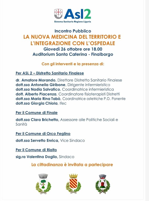 Domani, giovedì 26 ottobre, presso l'Auditorium Santa Caterina a Finalborgo, avrà luogo un incontro con la cittadinanza per discutere la nuova medicina del territorio e l'integrazione con l'ospedale. L'evento, che segue le precedenti iniziative nei comuni di Calice Ligure e Noli, ha lo scopo di informare i cittadini sui servizi sanitari a disposizione sul territorio, la loro organizzazione e le modalità di accesso, con un'enfasi particolare sull'integrazione tra territorio ed ospedale, in linea con quanto previsto dal PNRR (Piano Nazionale di Ripresa e Resilienza) e dal DM 77 (Decreto Ministeriale 77).