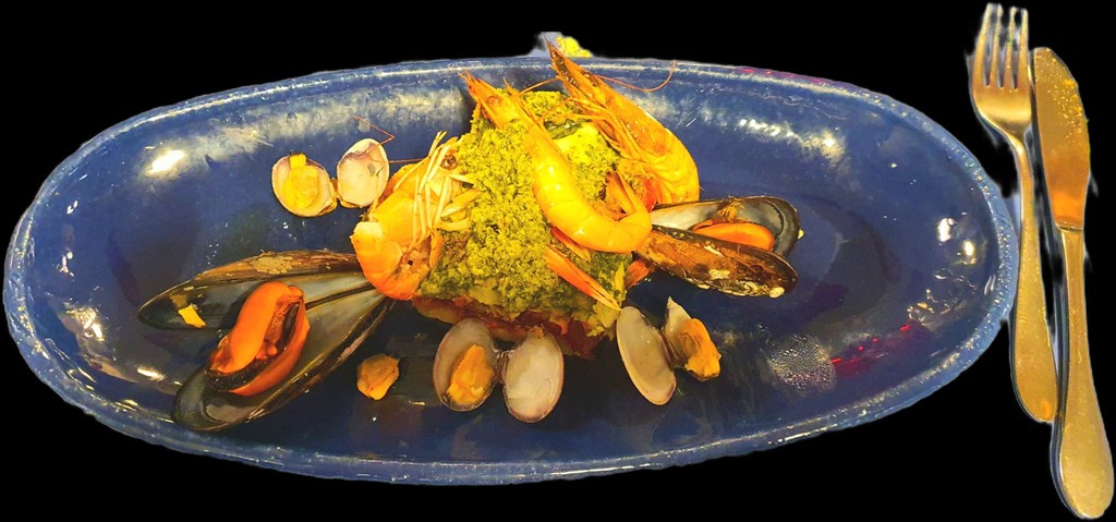 In entrata per stimolare le papille degustative delle deliziose polpettine di Baccalà con un pesto verde al Nasturzio. Poi un piatto ormai scomparso dalla tavola anche perché di lunga e complessa preparazione: il Cappon Magro della Pignatta rivisitato con passione e grane garbo che viene proposto come antipasto.
