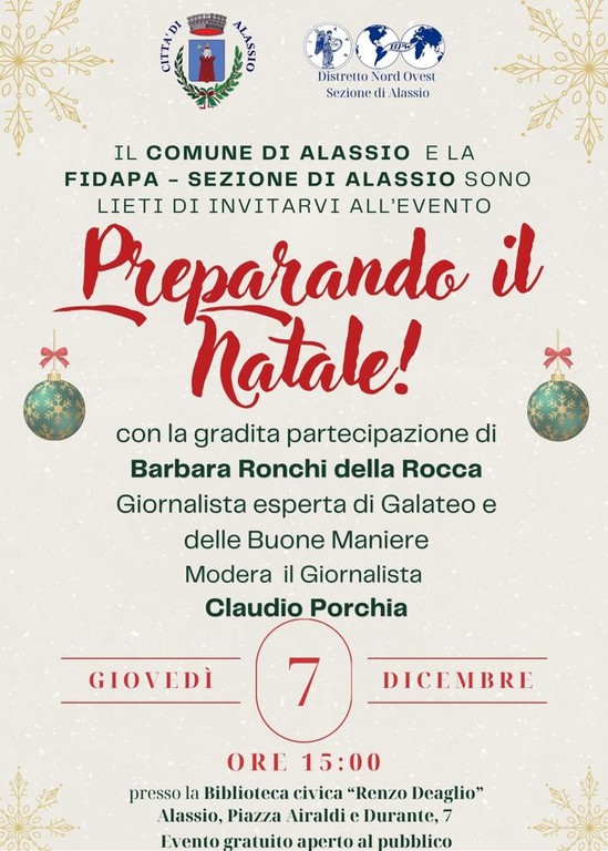 Il comune di Alassio e la FIDAPA sezione di Alassio invitano la cittadinanza alla conferenza di Barbara Ronchi della Rocca “Preparando il Natale”, che si terrà presso la biblioteca Renzo Deaglio giovedì 7 dicembre alle ore 15.00.