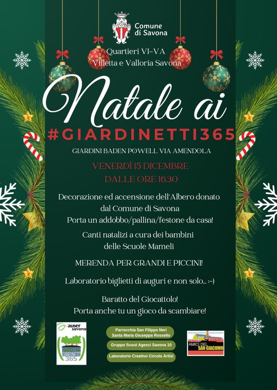 Col bellissimo coinvolgimento dei bambini e delle insegnanti delle "Scuole Mameli Istituto Comprensivo Savona II" che proporranno alcuni canti natalizi, la giornata prevederà: la decorazione ed accensione dell'Albero di Natale donato dal Comune di Savona, alcuni laboratori di palline di Natale e biglietti di auguri e un momento di "baratto" del giocattolo! Ci saranno tavoli per le varie attività e banchetti informativi ad esempio relativamente al progetto curato dagli Amici del San Giacomo.