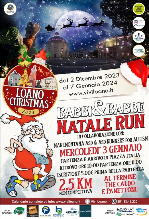 Sempre il 3 gennaio anche lo sport prende la scena con la "Babbi&Babbe Natale Run" in collaborazione con Maremontana ASD & ASD Runners for Autism. Una 2,5 km non competitiva con partenza e arrivo in piazza Italia, ritrovo ore 10.00 con partenza alle 11.00. Al termine thè caldo e panettone.