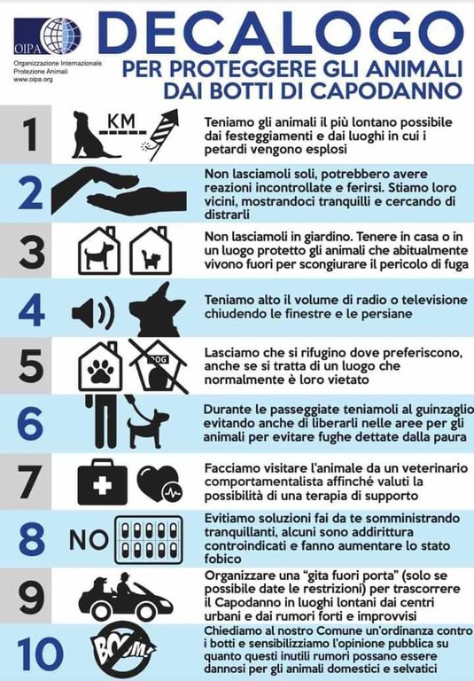 Proteggere gli amici a quattro zampe dai botti di Capodanno: con questo obiettivo, in vista della notte di San Silvestro, Oipa Italia - Organizzazione internazionale protezione animali – ha stilato il decalogo delle semplici regole per tenere al sicuro gli animali domestici.