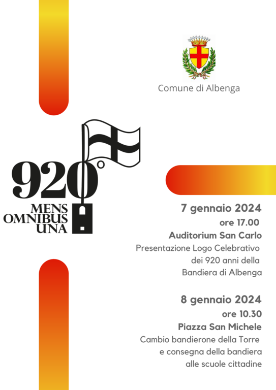 Il 7 gennaio 2024 alle ore 17 all’Auditorium San Carlo verrà presentato il marchio celebrativo e le prime iniziative che apriranno di fatto un calendario che andrà arricchendosi di tutti quegli appuntamenti, eventi ed iniziative che saranno proposti da associazioni del territorio al comitato organizzatore presieduto dal Professor Mario Moscardini. L’evento sarà anche l’occasione per inquadrare storicamente le origini degli albenganesi e della loro bandiera, grazie ad un approfondimento a cura dell’Istituto Internazionale di Studi Liguri.