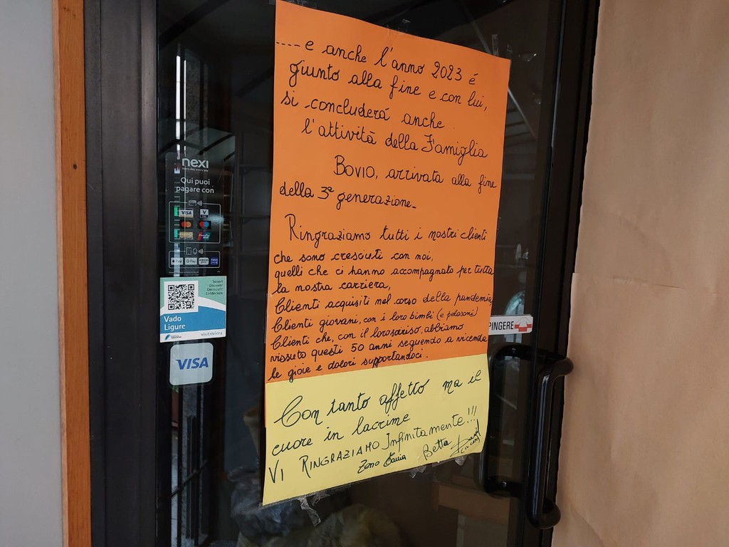 Così si è congedato il panificio Bovio, con un cartellone esposto sulla vetrina della storica attività di via Giuseppe Garibaldi a Vado Ligure che dopo più di 50 anni ha deciso di chiudere.