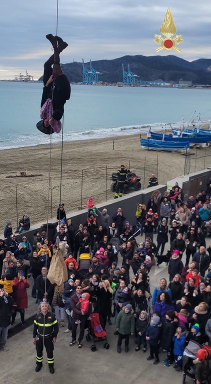 Il momento culminante della giornata si è avuto quando la Befana si è calata dall’autoscala ed ha distribuito dolci a tutti i presenti.