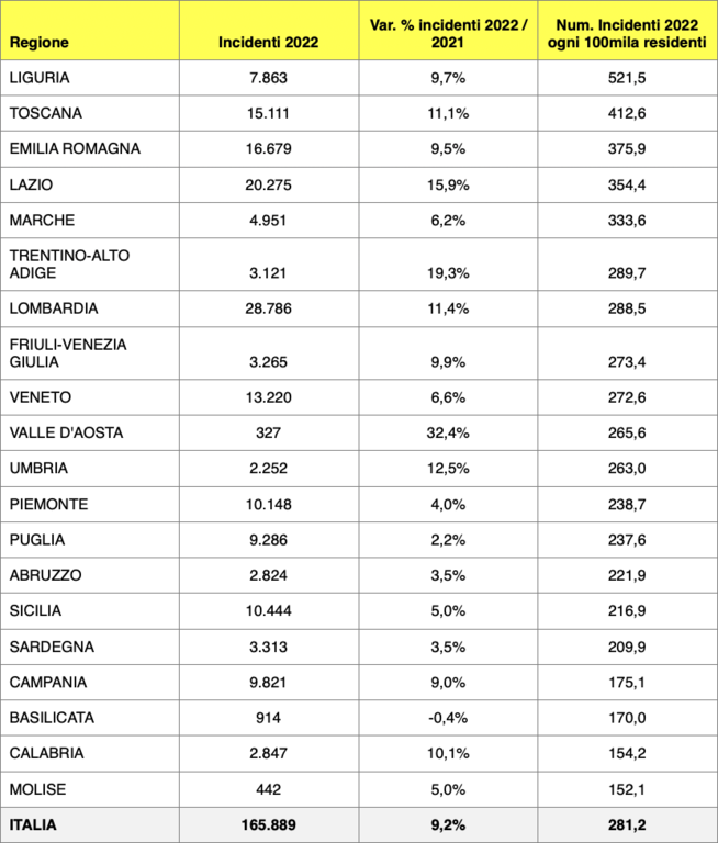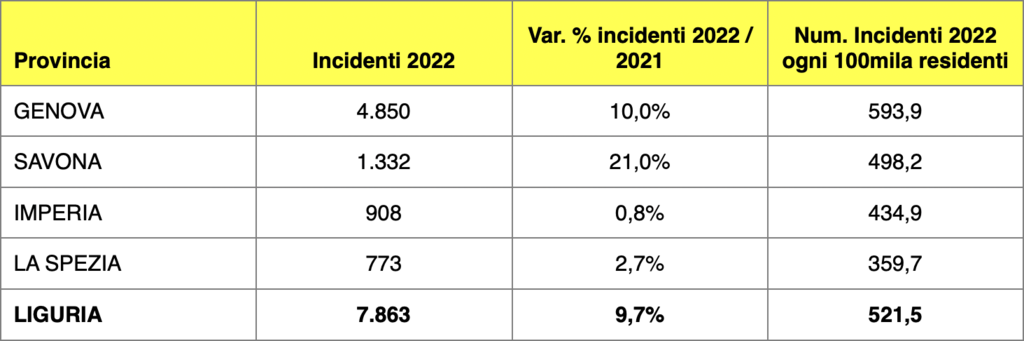 In Liguria, secondo l’elaborazione del Centro Studi di AutoScout24 su base dati ACI-Istat, nel 2022 ci sono stati 7.863 incidenti stradali (+9,7% sul 2021), con una media di 521,5 incidenti ogni 100mila residenti. Genova con 593,9 incidenti ogni 100 mila residenti è al primo posto, seguita da Savona con 498,2, poi Imperia con 434,9 e, infine, La Spezia con 359,7.