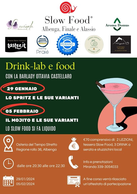 Sei un appassionato di drink e vuoi conoscere le ricette originali, la loro storia e vuoi stupire i tuoi amici con varianti local? Con la Condotta Slow Food Albenga-Finale-Alassio il 29 gennaio e il 5 febbraio con lezioni pratiche imparerai a realizzare drink anche a casa tua grazie alla barlady Ottavia Castellaro