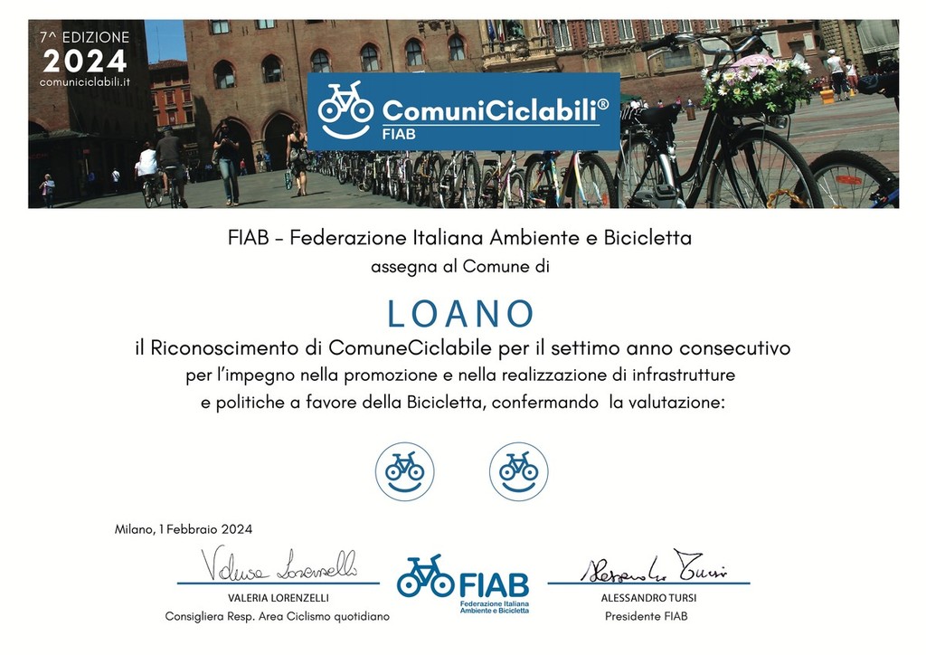 Il Comune di Loano ha ottenuto anche nel 2024 lo status di ComuneCiclabile, il riconoscimento della Federazione Italiana Ambiente e Bicicletta (Fiab) che valuta l'impegno dei territori italiani nel promuovere la ciclabilità come modello di mobilità sostenibile e che dal 2017 ad oggi ha coinvolto quasi 180 comuni italiani di ogni dimensione.