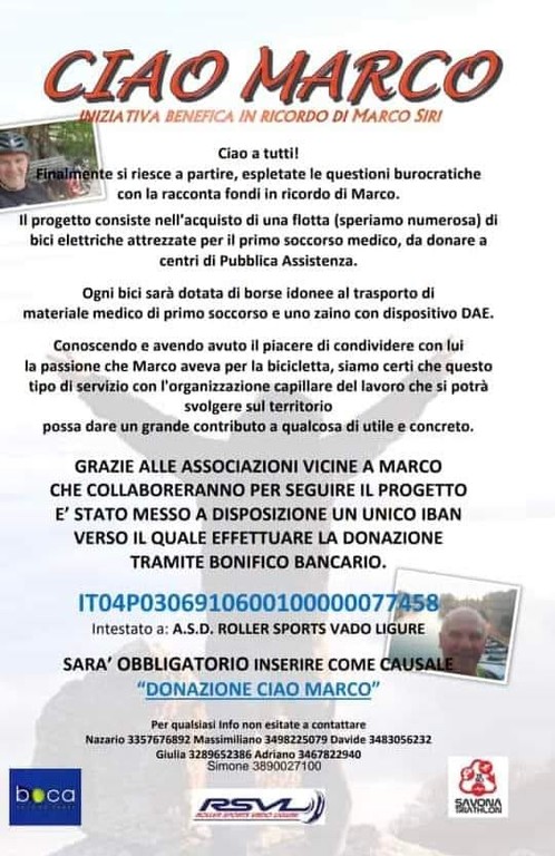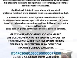 "Grazie alle associazioni vicine a Marco che collaboreranno per seguire il progetto è stato messo a disposizione un unico Iban verso il quale effettuare la donazione tramite bonifico bancario: IT04P030691060010000007745. Intestato a: Asd Roller Sports Vado Ligure. Sarà obbligatorio inserire come causale Donazione Ciao Marco".