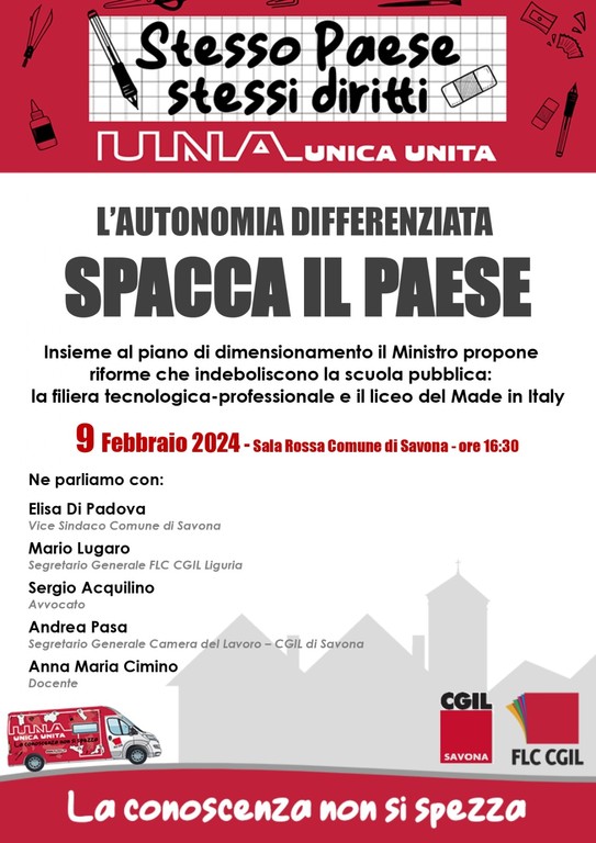 L’evento prenderà il via al mattino con il passaggio del Camper in Valle Bormida, dove si fermerà prima ad Altare e poi a Cairo. Nel pomeriggio il camper arriverà a Savona, in Piazza Sisto IV, con un’iniziativa in sala Rossa alle ore 16.30 alla quale saranno presenti: Elisa Di Padova vicesindaco Comune di Savona, Mario Lugaro Segretario Generale Flc Cgil Liguria, Sergio Acquilino avvocato, Andrea Pasa Segretario Generale Cgil Savona, Anna Maria Cimino docente.