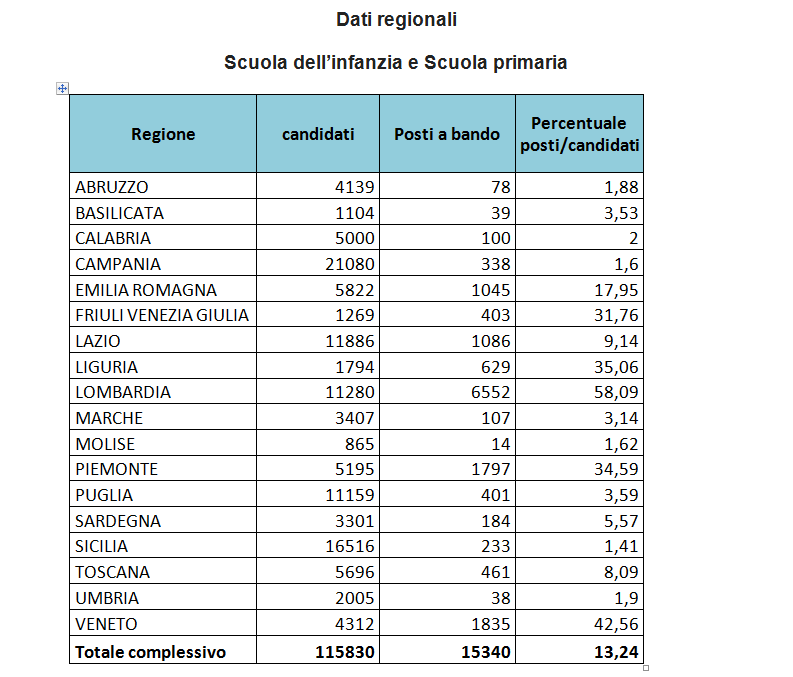 Le domande sono così suddivise fra posti comuni e sostegno: posti comuni: 397.631 domande per 24.107 posti; posti di sostegno: 39.720 domande per 5.207 posti.