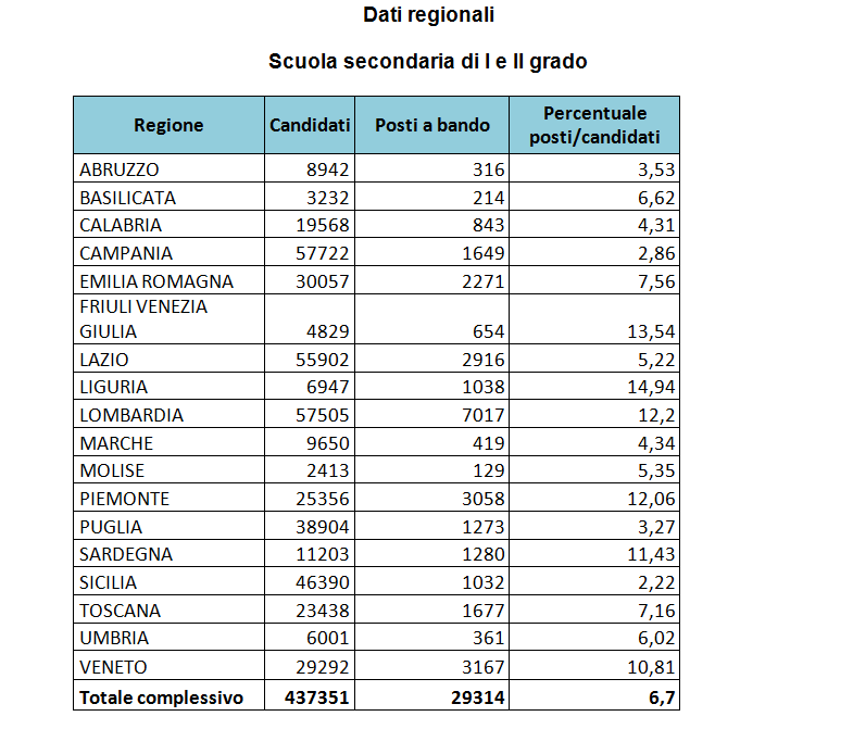 Concorso Scuola secondaria di I e II grado: candidati: 303.687; numero posti a bando: 29.314. Ciascun candidato, sulla base dei titoli posseduti, ha avuto la possibilità di iscriversi a un numero massimo di quattro procedure (una classe di concorso della Secondaria di I grado; una classe di concorso della Secondaria di II grado; posto di sostegno Secondaria di I grado; posto di sostegno Secondaria di II grado). In concreto, i 303.687 candidati hanno presentato 437.351 domande.