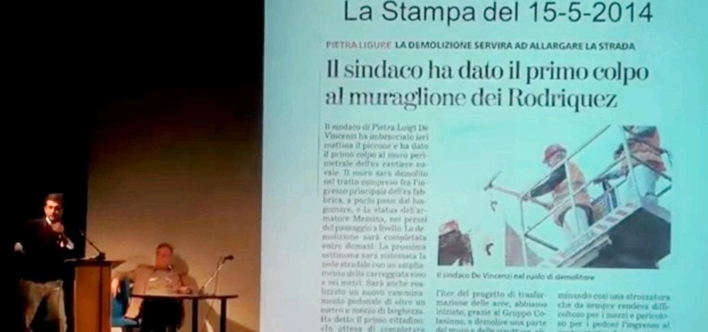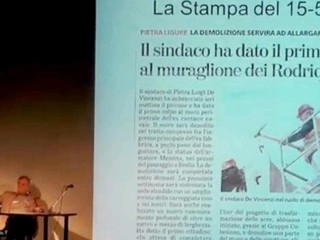 L'esponente di minoranza cita poi nuovamente le informazioni tratte da un recente articolo pubblicato sulla stampa locale di Bergamo: "Con sbigottimento e per puro caso, siamo venuti a sapere quali obiettivi la nuova proprietà bergamasca, subentrata al gruppo Colaninno, stia 'covando'. Ma non 'da sola', bensì con il coinvolgimento diretto del sindaco Luigi De Vincenzi. Si tratta, da quanto si è letto, al di là dei toni enfatici e propagandistici, della più consistente 'colata di cemento' della storia di Pietra Ligure, che se fosse attuata, supererebbe di gran lunga i peggiori esempi di 'devastazione' col cemento del territorio, di certi paesi della Liguria degli anni ‘60 o di certe periferie delle grandi città. Ecomostri giganteschi a forma di nave, sovrapposti trasversalmente uno all'altro e 'muri' di condomini di sei piani per innumerevoli nuovi appartamenti erano la cosa più sfacciatamente evidente. Verso questa ipotesi, ben illustrata da un rendering avveniristico reso di dominio pubblico dallo stesso articolo, forse, presumiamo, per invogliare i ricchi del nord a cominciare a fare un pensierino d'acquisto in questo nuovo 'paese delle meraviglie', il sindaco De Vincenzi ha manifestato tutto il suo apprezzamento, dichiarando che 'gli piace molto'; poi, spingendosi più in là, ha dichiarato che è 'allo stesso Comune' che l'operazione piaccia molto, pur non essendoci traccia, in Comune, di nessun deposito di nuovi progetti da parte della nuova proprietà. E pur mai, in questi ultimi anni, avendone informato il Consiglio comunale, che è competente nella materia dell'urbanistica e, conseguentemente, l'opinione pubblica di Pietra Ligure. Sta trattando da anni tutto in segreto".