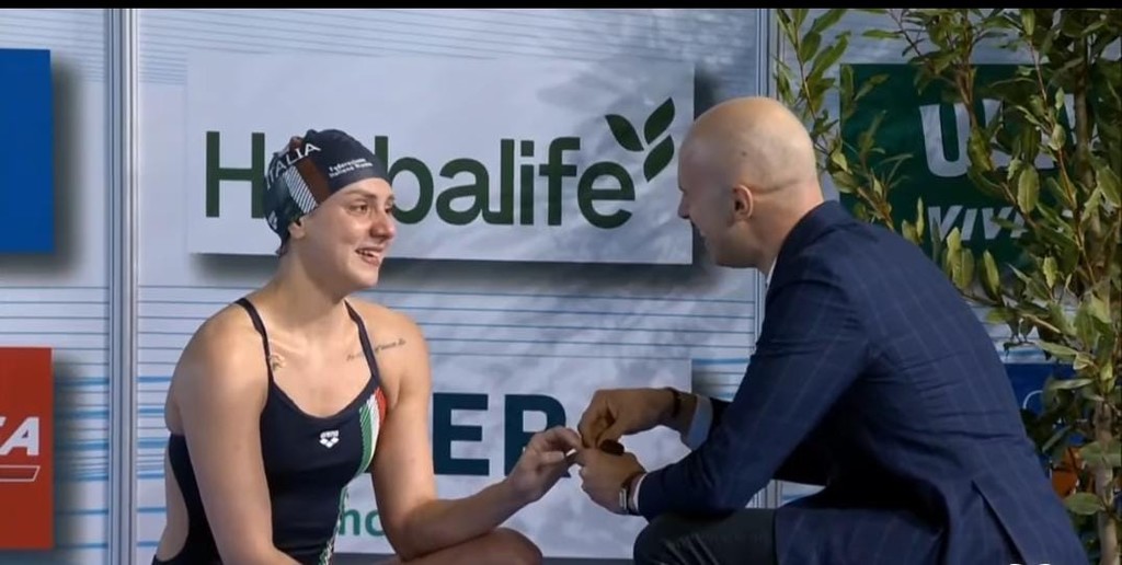 La sincronette, ieri, era impegnata in una delle sue gare, gli assoluti di nuoto sincronizzato di Riccione, con il pubblico sugli spalti. All'improvviso, con il sottofondo di una canzone di Giorgia, sullo schermo compare il fidanzato Francesco Giovannacci che sfoglia dei cartelli.