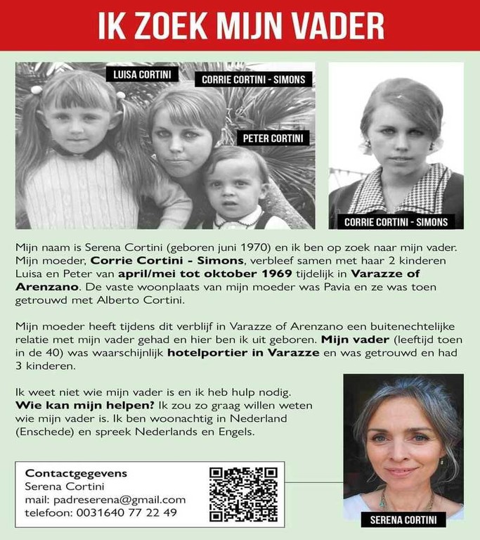 "Mi chiamo Serena Cortini (nata giugno 1970) e cerco mio padre. Mia madre, Corrie Cortini - Simons, soggiornò temporaneamente a Varazze o Arenzano con i suoi 2 figli Luisa e Peter da aprile/ maggio a ottobre 1969. La residenza di mia madre era Pavia e lei era sposata con Alberto Cortini - spiega la donna - Mia madre durante questo soggiorno a Varazze o Arenzano ha avuto una relazione con mio padre e sono nata da questa. Mio padre (sua etàin quel momento circa 40 anni) era probabilmente portiere di albergo a Varazze, era sposato, ed aveva 3 bambini. Mi piacerebbe sapere chi sia mio padre e ho bisogno di aiuto. Chi puo aiutarmi? Vivo nei Paesi Bassi (Enschede) e parlo olandese e inglese".