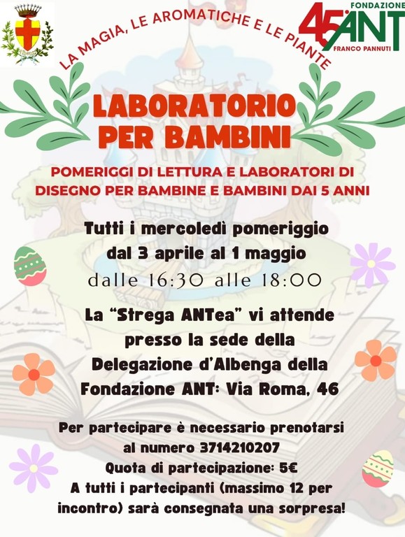 Ogni Mercoledì a partire dal 3 Aprile e per tutta la durata di Fior d'Albenga, presso il Charity point da Cuore a Cuore ANT in Via Roma 46 ad Albenga, si svolgeranno letture e laboratori di disegno a cura di "Strega ANTea" per bambine e bambini dai 5 anni.