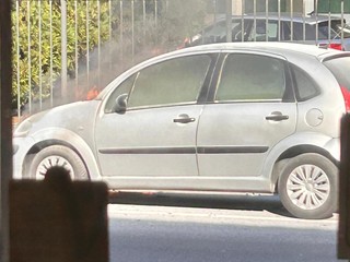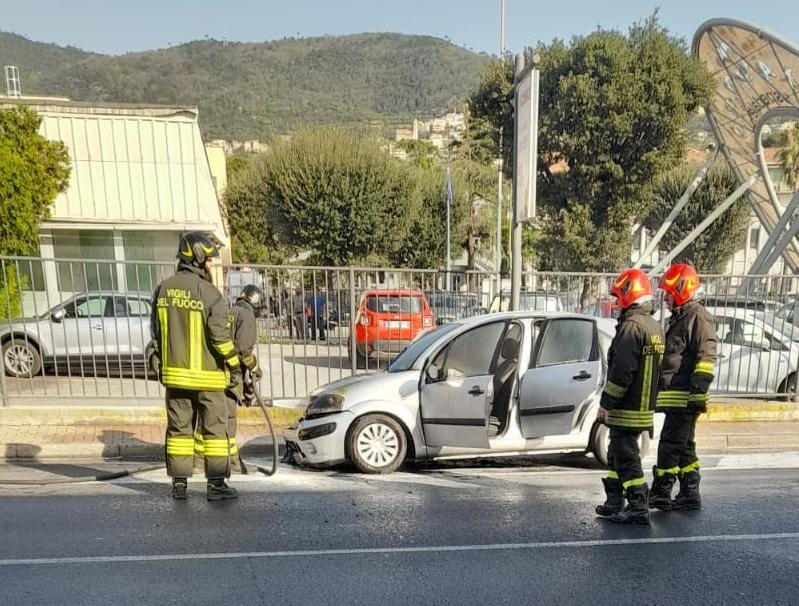 Vigili del fuoco in azione a Pietra Ligure per l'incendio di un'auto.
