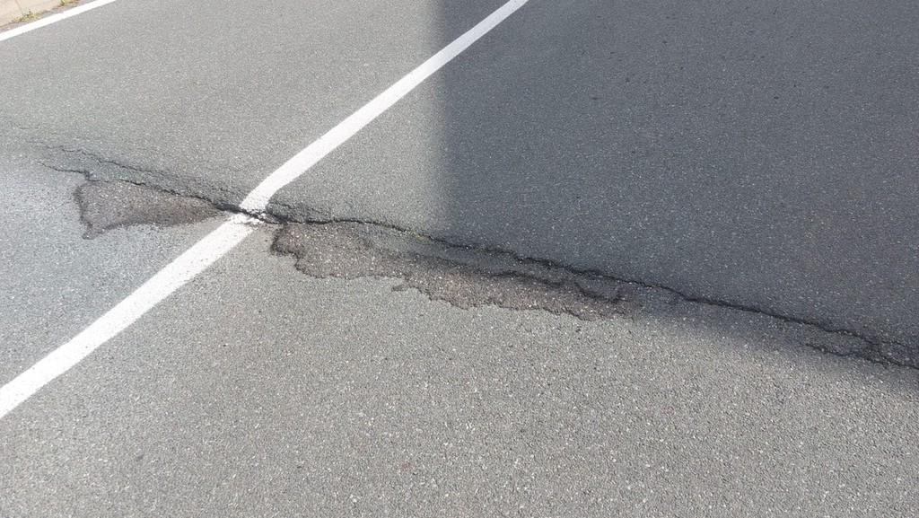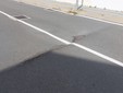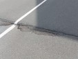 Il manto d'asfalto che da una parte cede e si crea uno "scalino" di quasi dieci centimetri e un tentativo di ridurlo con del bitume a freddo che non risolve affatto la situazione.