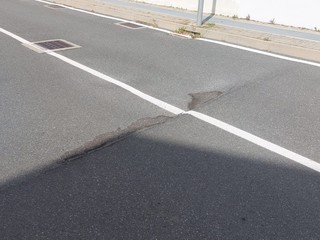 Il manto d'asfalto che da una parte cede e si crea uno "scalino" di quasi dieci centimetri e un tentativo di ridurlo con del bitume a freddo che non risolve affatto la situazione.