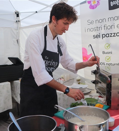 Francesco D’Amico, 29 anni e originario della Valle Camonica. Partendo da una importante tradizione familiare nella ristorazione, ha frequentato l’ISS Olivelli-Putelli di Darfo Boario e completato il suo percorso formativo con esperienze all’estero e alla scuola Alma di Cologno. Ha lavorato e lavora in importanti strutture, come il ristorante “Bella Iseo” del Gruppo “Aglio e Oglio”, dove ha appreso la passione per i prodotti del territorio, fra cui i fiori e le erbe.