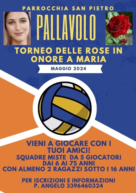 A maggio nella Parrocchia San Pietro Apostolo sarà possibile partecipare ad una speciale iniziativa all'insegna del gioco, del sano divertimento e della fraternità: il Torneo delle Rose di pallavolo in onore a Maria, nel mese a Lei dedicato. Le squadre saranno miste (maschi e femmine) e composte da 5 giocatori di tutte le età dai 6 ai 75 anni con almeno due ragazzi sotto i 16 anni. Le partite si svolgeranno dal 13 maggio dopo cena.