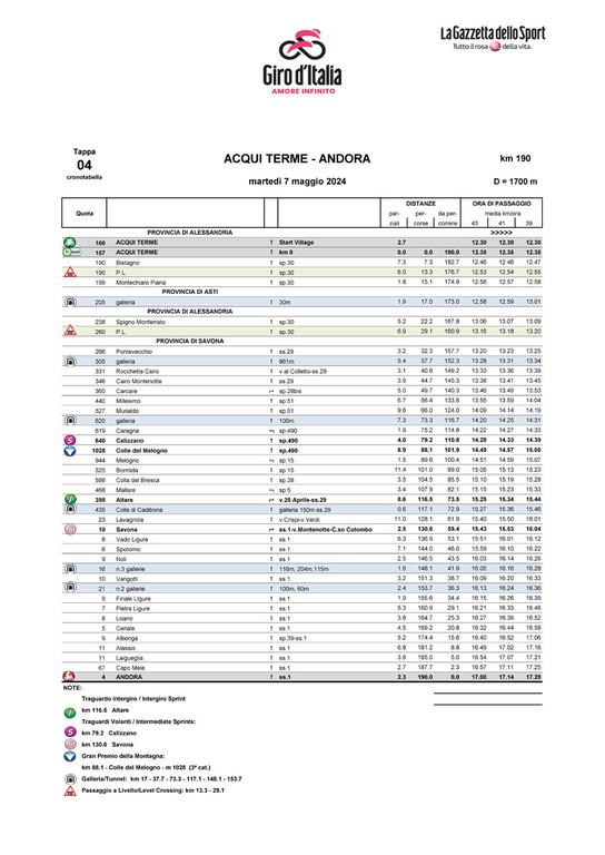 In allegato la Cronotabella dei passaggi della 4^tappa del Giro d’Italia