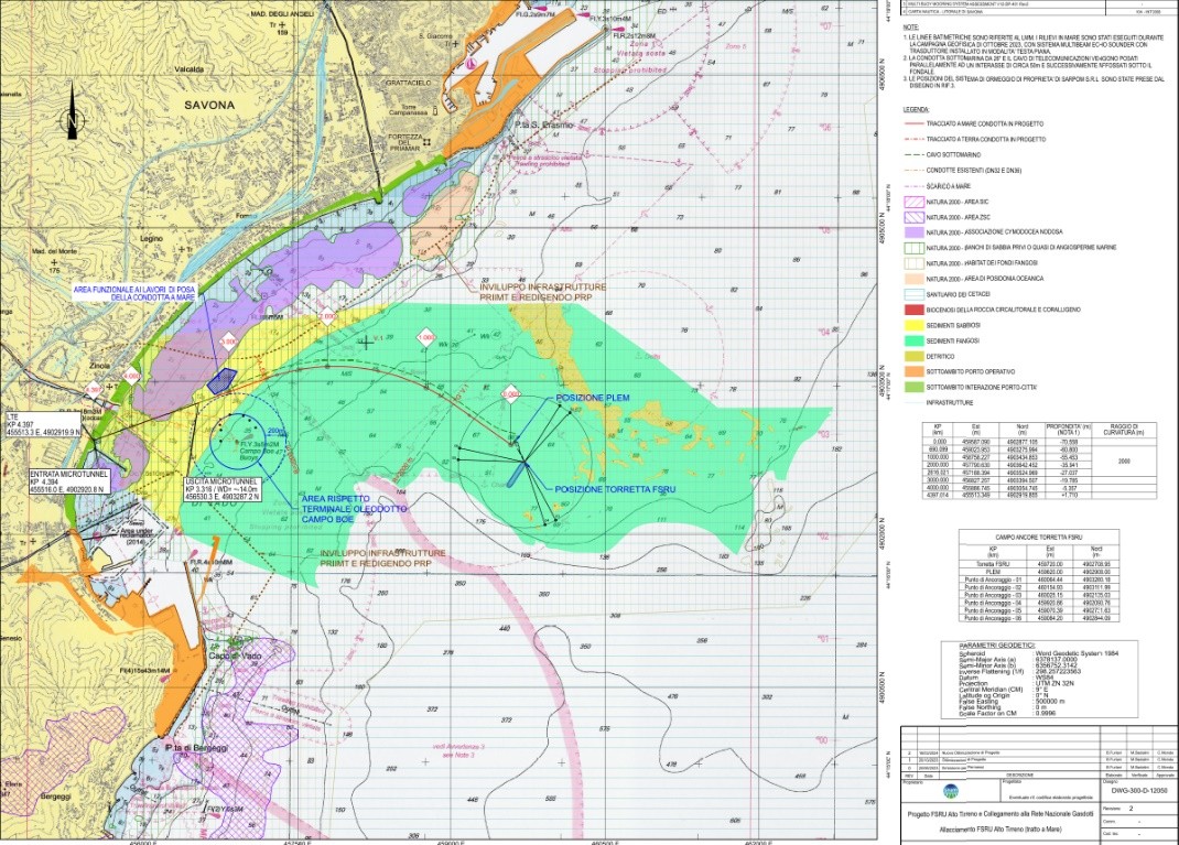 "La versione del Progetto FSRU Alto Tirreno e collegamento alla rete nazionali gasdotti presentata da Snam il 3/4/2024 ha modificato a terra il tracciato del gasdotto, in mare il punto di ormeggio e il sistema di ancore, e ha aggiornato vari documenti. L’impianto in mare prevede condotta verso terra, fibra ottica, piattaforma sottomarina di raccordo, boa a torretta e ormeggi che verrebbero allestiti in fase di Cantiere, tramite mezzi marini di servizio, nella rada di Vado. Questa, da Savona a Bergeggi, sottende un insieme di aree caratterizzate da specie di interesse comunitario e habitat prioritari, protetti secondo la direttiva UE o comunque di massimo rilievo".