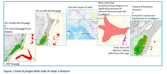 "In merito ai fondali della zona costiera ligure si sono svolte indagini a più riprese, portando gli esperti ad esempio a dire: 'Vi sono certamente delle differenze sito-specifiche, con un massimo di taxa di invertebrati cospicui (62) rilevati nel sito di Vado Ligure ed un minimo (11) rilevato per il sito di Nervi' [relazione marine strategy 2015 Arpal-Unige]. Le evidenze dei successivi sopralluoghi sono riportate nel documento di riferimento [nuovo atlante degli habitat marini della Liguria 2020 Regione Liguria] che annota la presenza di zone di pregio come Posidonia e Coralligeno. La vicina testa del canyon di Vado che poi si allunga a grande profondità costituisce un elemento di accelerazione, grazie alle correnti verticali'".