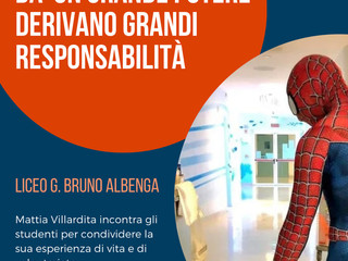 Mattia Villardita, il noto Spiderman savonese amico dei bimbi malati, questa mattina (7 maggio) ospite al Liceo G. Bruno di Albenga.