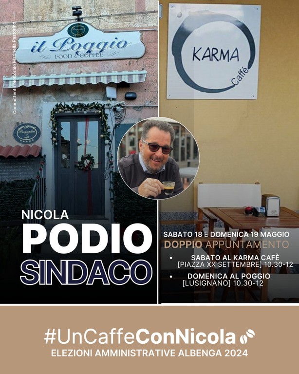 Sabato 18 e domenica 19 maggio doppio appuntamento con “Un Caffè con Nicola”, l’iniziativa di ascolto e condivisione del programma elettorale lanciata da Podio nelle scorse settimane.