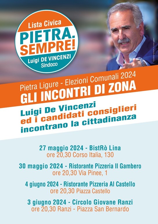 Dopo il primo appuntamento di settimana scorsa al “Paradiso del caffè” (ex bar “Pontevecchio”) di piazza Marconi, proseguono gli “incontri di zona” della lista civica “Pietra. Sempre! Luigi De Vincenzi Sindaco” con l’incontro dedicato alla zona del levante questa sera, lunedì 27 maggio, alle ore 20.30, al “BistRò Lina” di corso Italia 130.