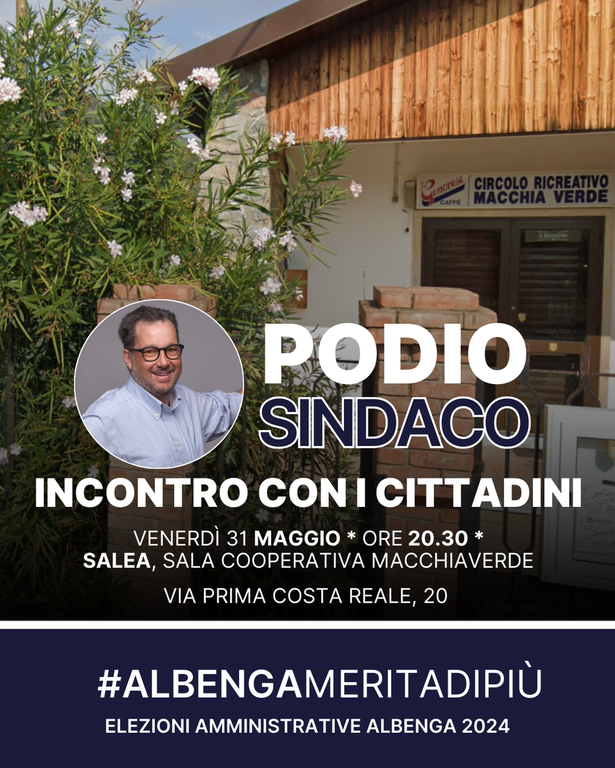 L'appuntamento con Nicola Podio e diversi candidati delle cinque liste a sostegno della sua candidatura si terrà presso la sala consiliare della Cooperativa Macchia Verde di Salea, in via Prima Costa Reale 20.