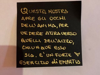 Un’esposizione fotografica che colpisce, emoziona, un viaggio nelle sensibilità sconosciute di queste persone a cui pochi si avvicinano. “Io vivo tutti i giorni queste esperienze e con questa mostra ho voluto avvicinare mondi che sembrano distanti. Le persone con problemi psichiatrici sono come le altre, hanno pensieri e il forte bisogno di essere ascoltate, come tutti – spiega -. Quando gli autori sono venuti a visitare la mostra, non riuscivano a credere che qualcuno potesse essere interessato a ciò che avevano realizzato. Un’emozione forte e positiva che li ha fatti sentire bene. Erano anche molto curiosi di sapere cosa pensano i visitatori, quindi, ho poi deciso di mettere a disposizione dei post-it dove ognuno può lasciare le proprie impressioni”.