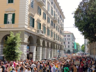 Il corteo è partito da piazza delle Nazioni e ha attraversato piazza Martiri della Libertà, via Don Minzoni, piazza del Popolo, piazza Mameli, via Paleocapa, piazza Sisto e Corso Italia per poi concludersi al Prolungamento in piazzale Eroe dei Due Mondi.