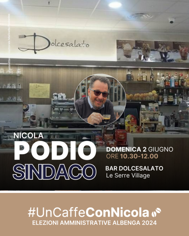 È in programma domenica 2 giugno presso il bar “Dolcesalato” a “Le Serre Village” il nuovo appuntamento con “Un Caffè con Nicola”, l’iniziativa di ascolto e condivisione del programma elettorale del candidato sindaco del centrodestra ingauno Nicola Podio.