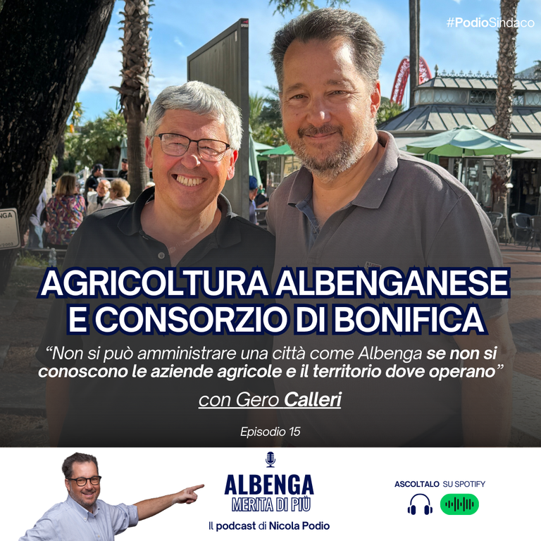 È l’agricoltura albenganese il tema centrale del 15esimo - e ultimo episodio prima del voto - del podcast “Albenga merita di più”, lo spazio di approfondimento del programma elettorale del candidato sindaco del centrodestra Nicola Podio. Ospite d’eccezione della puntata è stato Gero Calleri, consigliere comunale uscente, imprenditore e già candidato sindaco nel 2019.