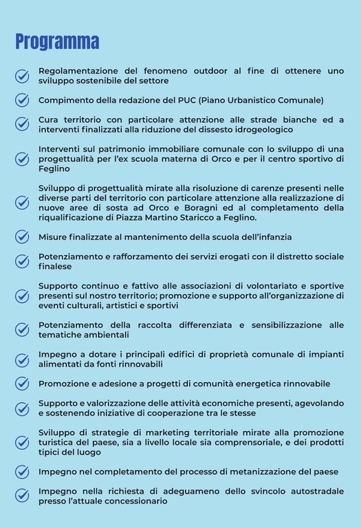 In questo contesto si inquadra anche la gestione del patrimonio immobiliare comunale, in particolare con l'ex scuola di Orco "che necessita di una profonda riqualificazione, crediamo con finalità turistico-ricettivo" o il campo sportivo di Feglino dove sono in corso operazioni di riqualificazione "cercando di massimizzarne i benefici sia in termini economici che di utilità, prevedendone anche il completamento, dove riteniamo possa trovare spazio una tensostruttura che sopperisca alla mancanza in paese di uno spazio coperto per ritrovarsi".