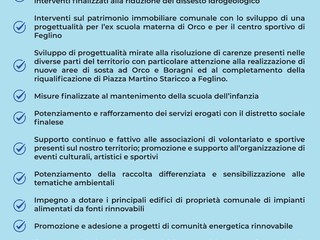 In questo contesto si inquadra anche la gestione del patrimonio immobiliare comunale, in particolare con l'ex scuola di Orco "che necessita di una profonda riqualificazione, crediamo con finalità turistico-ricettivo" o il campo sportivo di Feglino dove sono in corso operazioni di riqualificazione "cercando di massimizzarne i benefici sia in termini economici che di utilità, prevedendone anche il completamento, dove riteniamo possa trovare spazio una tensostruttura che sopperisca alla mancanza in paese di uno spazio coperto per ritrovarsi".