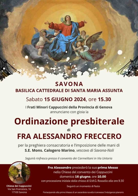 Sabato 15 giugno alle ore 15:30 nella Cattedrale Nostra Signora Assunta il frate minore cappuccino Alessandro Freccero sarà ordinato presbitero dal vescovo Calogero Marino. Seguirà un rinfresco nel vicino convento dei Carmelitani Scalzi, in via Untoria 6. Savonese d'origine, fra Alessandro Freccero appartiene alla comunità francescana della Provincia di Genova e alla fraternità del Convento San Francesco d'Assisi, nel quartiere Villetta.