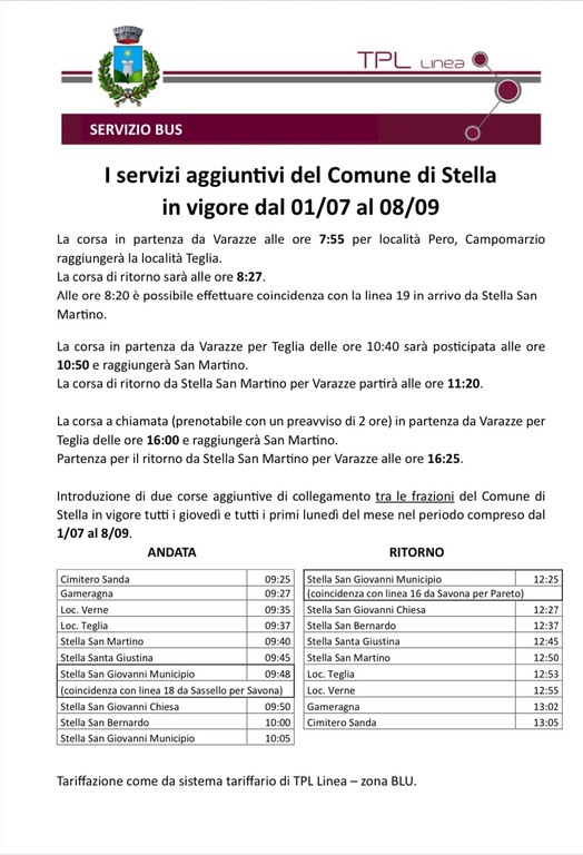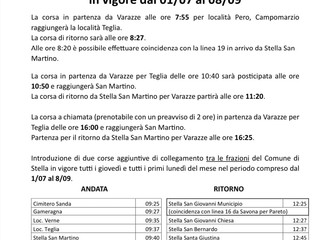 "Ed ecco qui un piccolo/grande risultato in merito al servizio di trasporto pubblico locale. Come da promessa elettorale abbiamo lavorato in questo periodo per riuscire a determinare due nuovi servizi che partiranno a livello temporaneo per determinarne la reale fruizione degli utenti - spiega il primo cittadino - Dall'1 di Luglio all’8 Settembre infatti verrano istituite due nuove corse. La prima, vedrà il nuovo collegamento tra Stella e Varazze, ormai quasi totalmente assente da anni. La seconda sarà invece il tanto desiderato collegamento tra tutte e 5 le nostre frazioni".